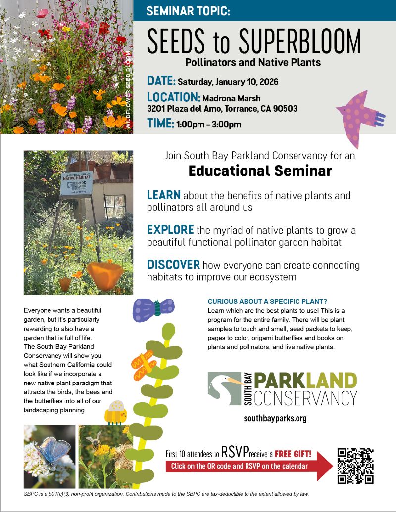 Everyone wants a beautiful garden, but it’s particularly rewarding to also have a garden that is full of life. The South Bay Parkland Conservancy will show you what Southern California could look like if we incorporate a new native plant paradigm that attracts the birds, bees, and butterflies into all of our landscape planning.