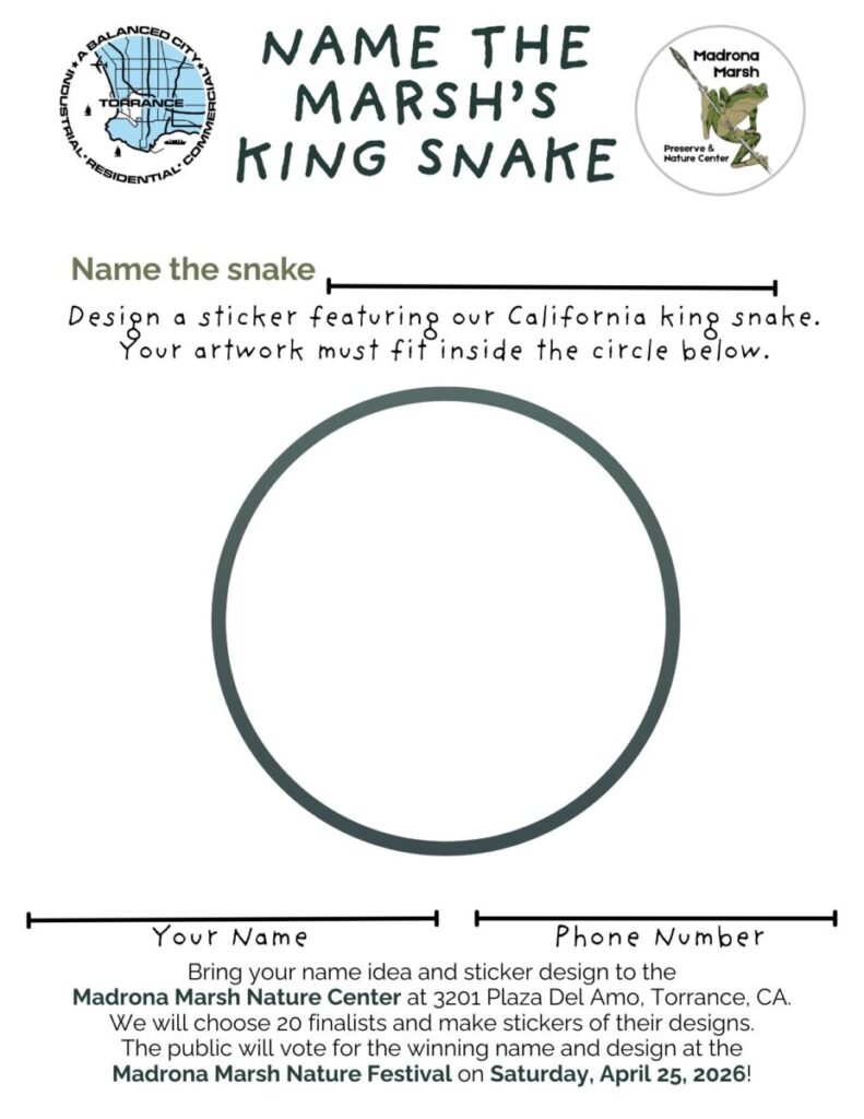 Download the Name the Marsh’s King Snake PDF and bring your name idea and sticker design to the Madrona Marsh Nature Center at 3201 Plaza Del AMo, Torrance, California.