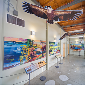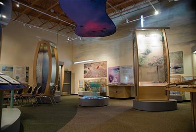 The 8,000-square-foot Nature Center includes a reception area, exhibit hall, classroom, project lab, curation lab, restrooms, gift shop, staff offices, administrative area, volunteer room, and storage rooms. The Center is handicap-accessible and has a large parking area and a small picnic area. Mature native California Sycamore trees shade all the grass lawns.